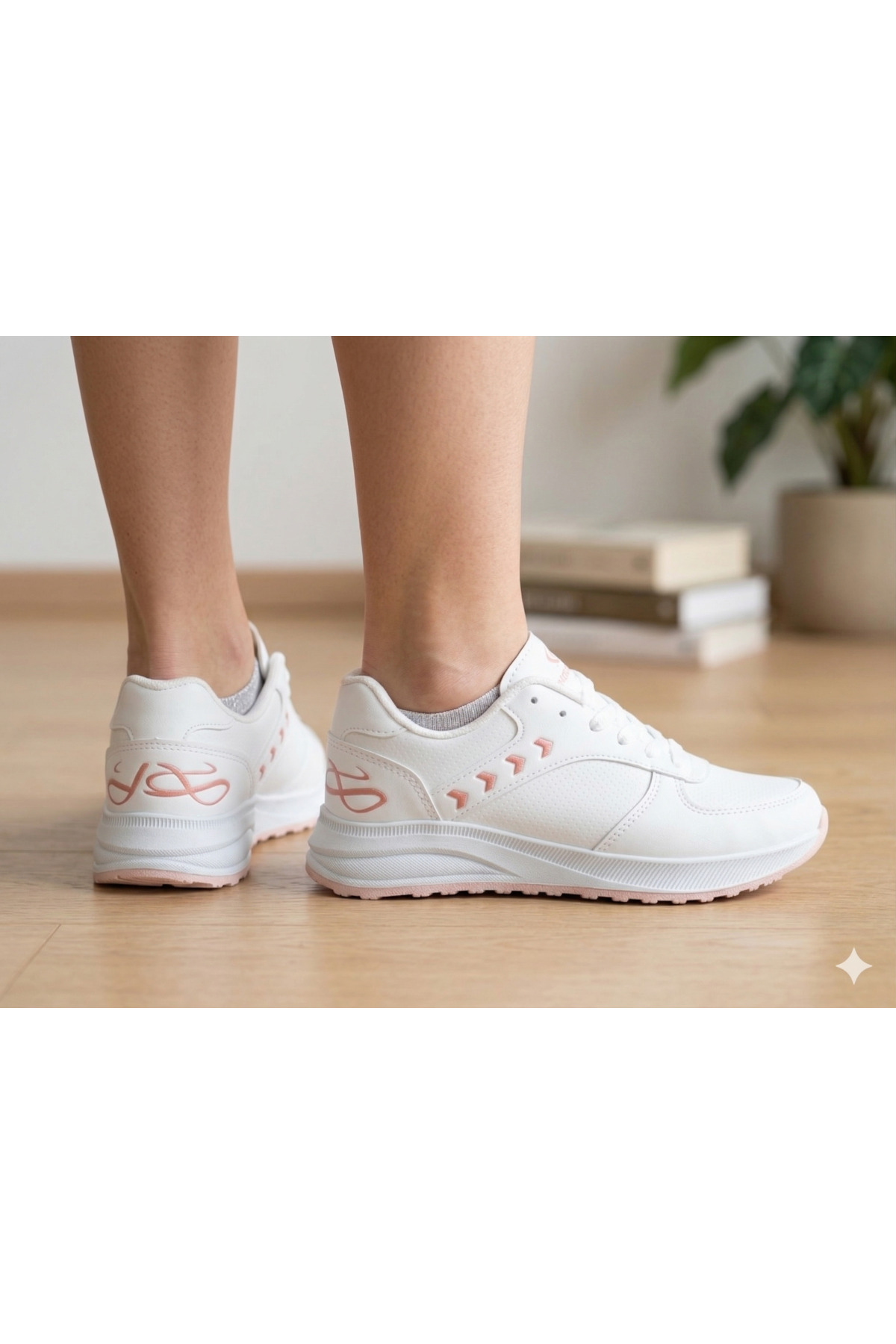 - Beyaz ve pembe renk kombinasyonu, feminen bir görünüm sunar.